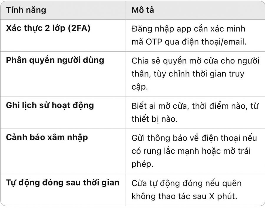 • Mở/đóng cửa từ xa qua ứng dụng điện thoại.