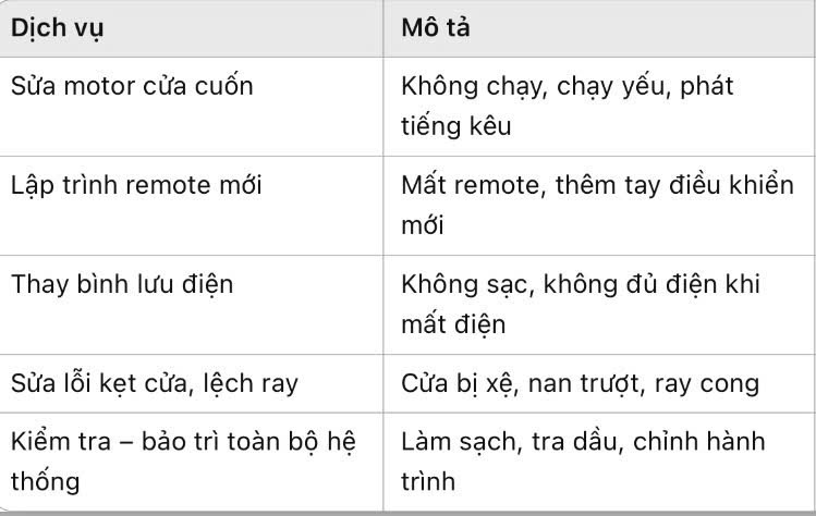 • Có thể sửa tất cả các dòng cửa cuốn: Austdoor, Titadoor, Đài Loan, tấm liền, khe thoáng…